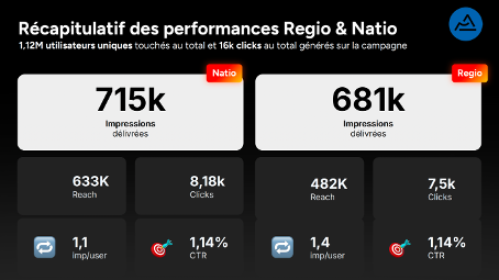 Le volet régional a généré 715k impressions, 482k reach et 7,5k clics (CTR 1,14%, 1,4 imp/user) tandis que le national affichait 681k impressions, 633k reach et 8,18k clics.