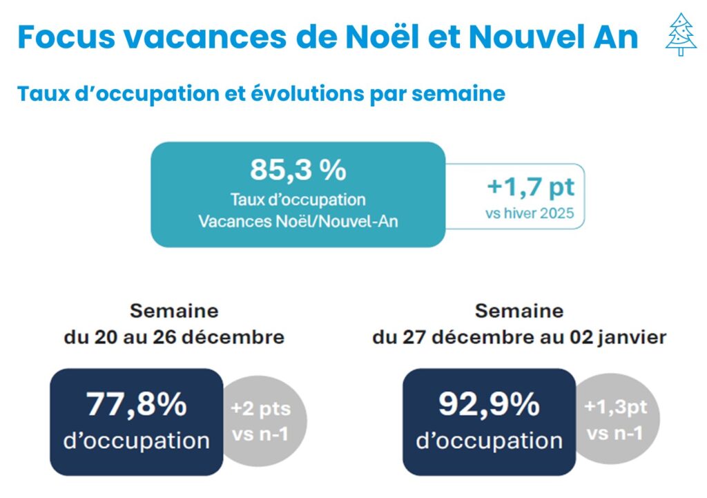 Grâce à un positionnement des jours fériés favorable (Noël et le Jour de l’An tombent des jeudis), les vacances de fin d’année affichent un taux d’occupation moyen de 85,3 %, en hausse de +1,7 pts par rapport à la même période l’an passé.