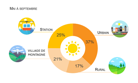 L’été concentre la majorité des séjours en juillet et août pour tous les espaces, mais avec des pics différents. Les stations de montagne enregistrent un pic extrême en août (46,5 % des nuitées) et un important volume en juillet (26,9 %), les villages de montagne connaissent une saison un peu plus étalée, avec 41,2 % en août et 23,7 % en juillet. Les villes réalisent la moitié de leur fréquentation en cœur de saison (32,7 % en août et 17,3 % en juillet), proportion qui monte à 55% en campagne (39,9 % en août et 15,2 % en juillet). Le mois de septembre reste significatif dans les villages de montagne et la campagne (respectivement 16,6 % et 19,9 %).
