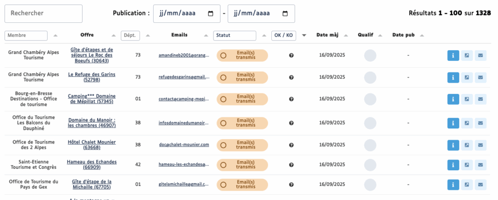- Les offres « Gîtes de France » apparaissent pour l’ensemble du département : merci de faire abstraction de celles qui ne relèvent pas de votre territoire.